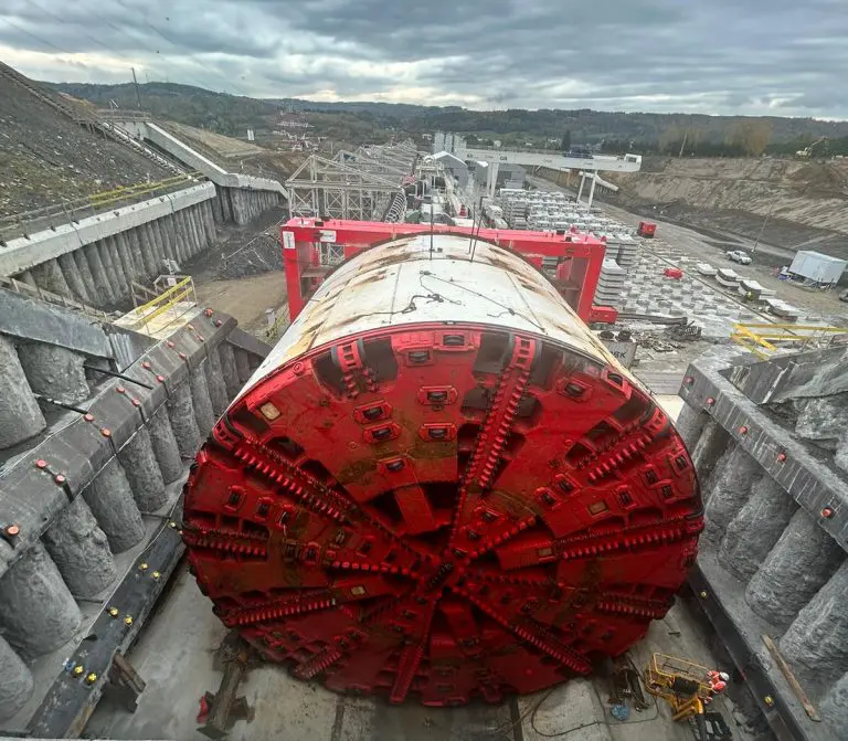 In this work, the tunnel boring machine “Karpatka” will operate to a maximum depth of 100 metres to build a double tunnel of 2.2 kilometers. This tunnel will form part of a new section of 10.3 miles of track, which will be two-lane, 15 intersections and a step additional emergency.