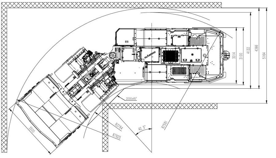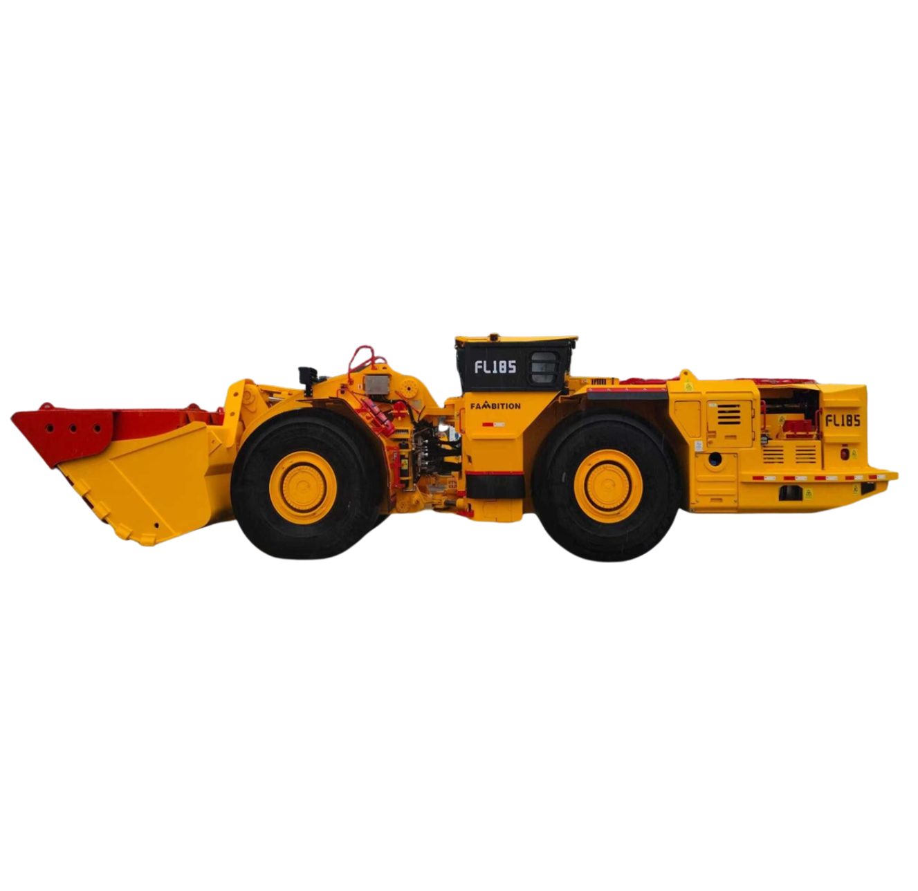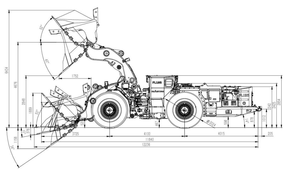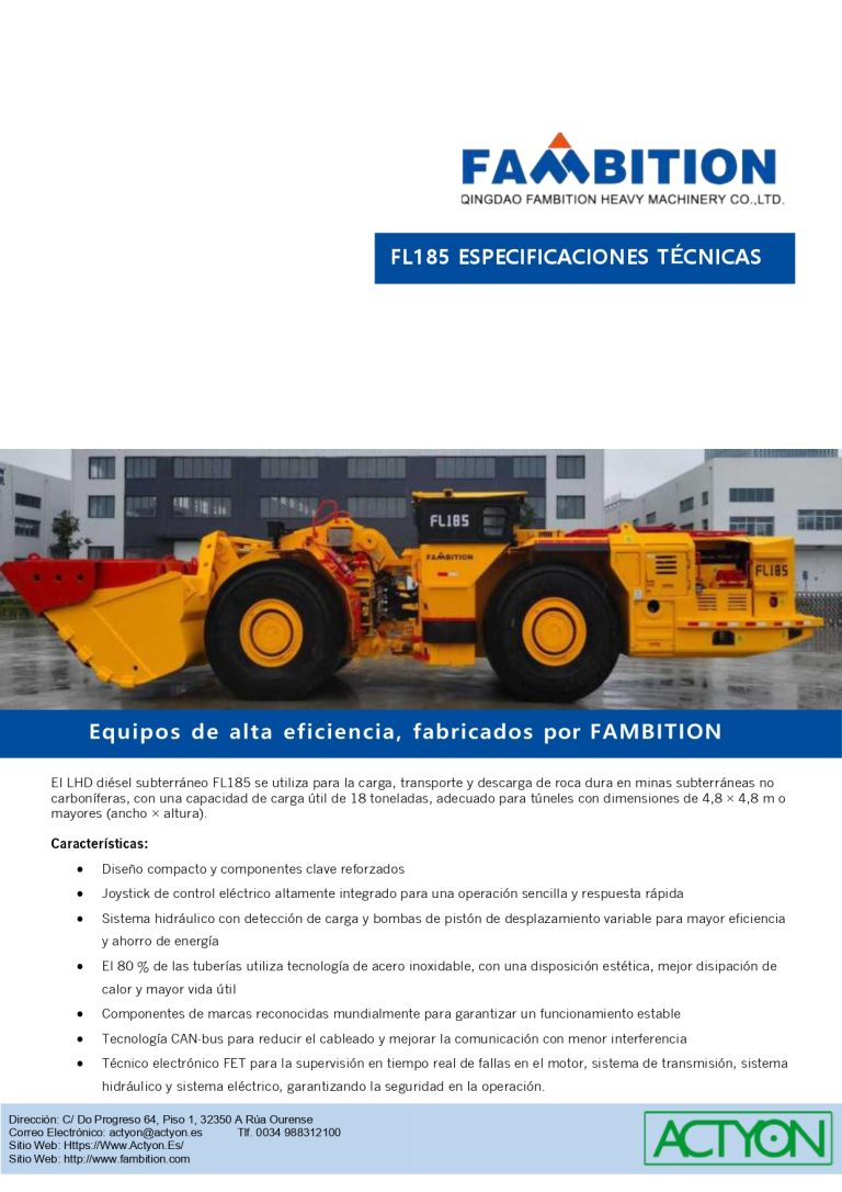 El LHD diésel subterráneo FL185 se utiliza para la carga, transporte y descarga de roca dura en minas subterráneas no carboníferas, con una capacidad de carga útil de 18 toneladas, adecuado para túneles con dimensiones de 4,8 × 4,8 m o mayores (ancho × altura).